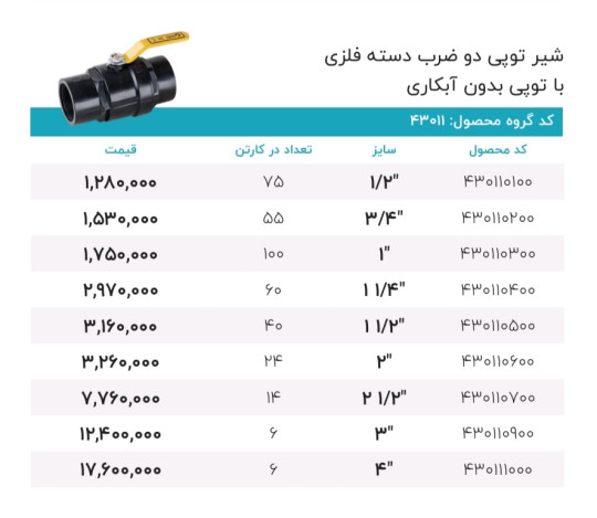 شیر توپی دوضرب دسته فلزی با توپی بدون آبکاری